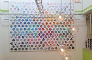 Die rund 440 Blüten konnten nicht alle im großen Werk Platz finden. So wurden sie einzeln an den leeren Wänden des Rathauses der Reihe nach befestigt. Dadurch eintstand eine sehr freundliche und aufgelockerte Raumwirkung.